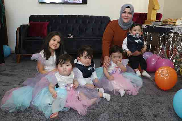 Huyluoğlu çifti, bir yaşına giren çocukları Yusuf, Hamza, Muhammed, Selma ve Necla için Antakya’daki evlerinde doğum günü partisi düzenledi.