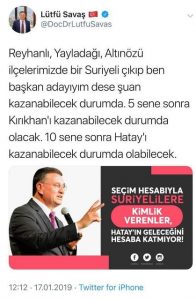 Vatandaş yapılan Suriyeler konusu, sığınmacıların yoğunlaştığı kentlerde tartışılırken, gözler, 31 Mart seçim sandıklarını izliyor. Zira şu ana kadar vatandaşlık hakkı kazanan Suriyelilerin, sandıklardaki dengeyi değiştirebilecek kalabalığa ulaştığı söyleniyor ve eleştiriler de bu noktada yoğunlaşıyor. Hatırlanacağı gibi, bu konuda en dikkati çeken eleştirilerden biri, Hatay Büyükşehir Belediye Başkanı Lütfü Savaş’tan geldi. Twitter hesabından açıklamada bulunan Savaş, “Reyhanlı, Yayladağı, Altınözü ilçelerimizde bir Suriyeli çıkıp ben başkan adayıyım dese şuan kazanabilecek durumda. 5 sene sonra Kırıkhan’ı kazanabilecek durumda olacak” demiş, “10 sene sonra Hatay’ı kazanabilecek durumda olabilecek” diye de eklemişti.