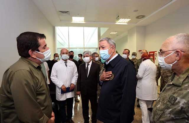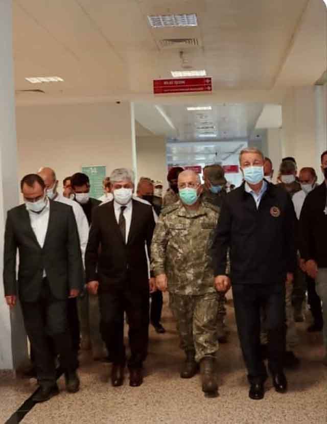 “Millî Savunma Bakanı Hulusi Akar, beraberinde Genelkurmay Başkanı Org. Yaşar Güler ve Kara Kuvvetleri Komutanı Org. Musa Avsever ile beraber, İdlib’deki saldırıda yaralanan askerleri hastanemizde ziyaret etti.
