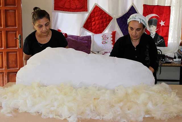 Mesleğini endüstriyel sektöre karşı ayakta tutmaya çalışan Güzelyurt, evine kurduğu atölyede yorganları doğal ürünlerle hazırlıyor.