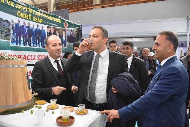Kaymakam ve Belediye Başkanı, gün boyu stantta oturup ikram emek suretiyle ziyaretçilere Altınözü ZEYTİNİ ve ZEYTİNYAĞI’nı tanıtmaya çalışıyor. -Cemil Yıldız-