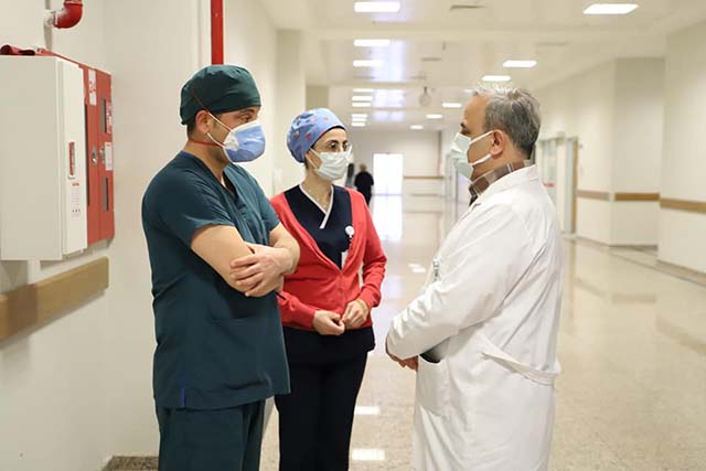 “Başhekimimiz Dr. Mahmut Bayrakçıoğlu, günün ilk saatlerinde yoğun bakım ünitelerine bir ziyaret gerçekleştirdi. Ziyaretleri kapsamında, tedavi gören hastaların durumları hakkında sorumlulardan bilgi alan Başhekimimiz Dr. Bayrakçıoğlu, yerinde değerlendirmelerde bulundu. Başhekimimiz Dr. Mahmut Bayrakçıoğlu, sağlık çalışanlarımıza, gösterdikleri özverili ve gayretli çalışmalarından dolayı kolaylıklar ve başarı dileyerek, yoğun bakım ünitelerinden ayrıldı.” -Selvi Günay-
