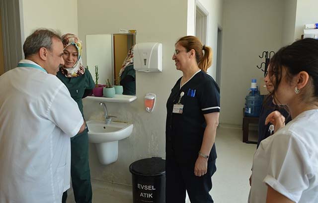 Hatay Devlet Hastanesi Başhekimi Dr. Mahmut Bayrakçıoğlu, Başhekim Yardımcıları ve Sağlık Hizmetleri Müdürü, birlikte rutin olarak öğle araları gerçekleştirdiği çay ziyaretlerine devam ediyor. Başhekim ve beraberindeki heyet, bu uygulamasına önceki gün, Ortopedi Servisi ve Kalp Damar Servisi ziyaretiyle devam etti. Gerçekleştirilen ve sohbet ortamında geçen ziyarette servis sorumlusu hemşire ve sağlık çalışanlarıyla sohbet gerçekleştiren Başhekim Dr. Bayrakçıoğlu, servislerin genel durumu ve uygulamaları hakkında sorumlulardan bilgi aldı. Akabinde değerlendirmelerde bulunan Başhekim Dr. Mahmut Bayrakçıoğlu ve beraberindekiler, çalışanlara başarı ve kolaylıklar dileyerek ziyaretlerini tamamladılar. -Selvi Günay-