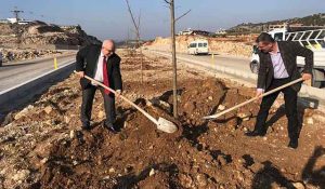 Yayladağı Belediye Başkanı Mustafa Sayın, kravatlı takım elbisesiyle kazmayı eline alıp toprağı kazıdı, ağaç dikti.