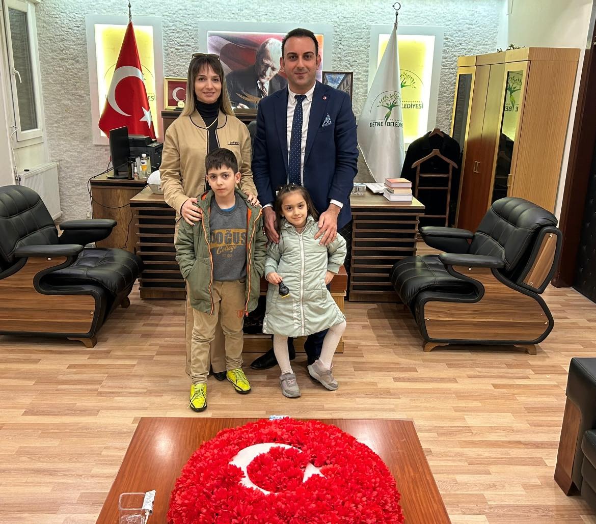 Defne Belediye Başkanı Halil İbrahim Özgün seçildiği günden bu yana yoğun bir mesai yapıyor. Bazı günler gece geç saatlere kadar eve gidemeyen ve çocuklarını göremeyen belediye başkanı Halil İbrahim Özgün’ü çocukları ve eşi mesai saatlerinin sonunda makama giderek alıyor ve eve götürüyor. Özgün ailesinin bu güzel tablosu Defne Belediyesinde yüzleri güldürüyor.