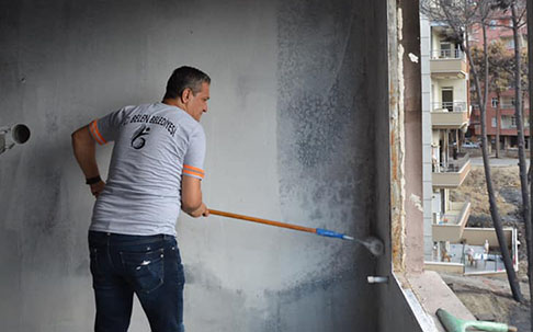 Belen Belediye Başkanı İbrahim Gül de, işçilerine destek olmak üzere eline fırçayı aldı ve yanan bir evin boyanmasında yardımcı oldu.