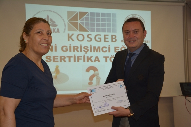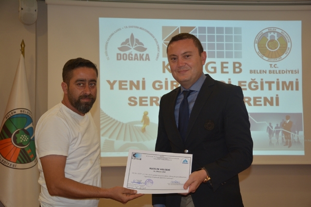 Doğu Akdenmiz Kalkınma Ajansı (DOĞAKA) ve KOSGEB işbirliği ile Belen ilçesinde düzenlenen Uygulamalı Girişimcilik Eğitimi sona erdi. Sertifika Töreni de Belen Belediyesi toplantı salonunda yapıldı. DOĞAKA Hatay Yatırım Destek Ofisi Koordinatörü. Cenk Özbaykal, Belen Belediye Başkanı Adnan Vurucu ve Belen Kaymakamı Abdulaziz Aydın’ın konuşmalarıyla başlayan törende, kursiyerlerden, kurmak istedikleri işler hakkında bilgi alındıktan sonra, 2017 Yılı Uygulamalı Girişimcilik Eğitimi Kursu’nda başarılı olan kursiyerlere protokol tarafından sertifikaları takdim edildi. -Selvi Günay-