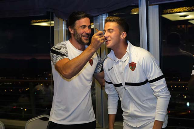Erzurum’da, yüksek irtifa tesislerinde konaklayan Hatayspor futbolcuları, Pazartesi günü 19 yaşını dolduran, 12 Temmuz 2002 doğumlu, İstanbul-Sarıyerli Bertuğ Özgür Yıldırım’a yaş pastalı sürpriz bir kutlamada bulundu. Bertuğ’a, kesilen pastadan ilk parçayı, Teknik Direktör Ömer Erdoğan kendi eliyle yedirdi. -Cemil Yıldız-