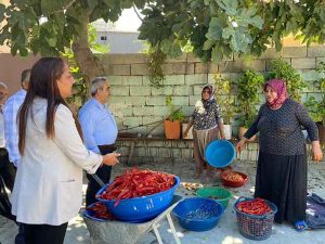Girdiği evin avlusunda iş yapan, biber salçası üretmeye çalışan kadınlarla karşılaşan Özgürsoy, emek veren ve üreten kadınlara hem başarı hem sağlık diledi. Milletvekili Özgürsoy, biber salçası kurutma ve imalatı yapan kadınlarla sohbeti sırasında yardım etmeye de çalıştı. -Cemil Yıldız-