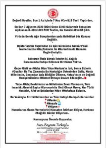 AK Parti Hatay Milletvekili Hacı Bayram Türkoğlu, twitter hesabından yaptığı paylaşımda, “1 ay içinde 7 kez Kovid-19 testi yaptırdım. En son açıklanan 8. PCR testim ne yazık ki pozitif çıktı” açıklamasını yaptı. Türkoğlu’nun bu açıklamasının ardından, Türk Tabipleri Birliği’nden (TTB) tepki geldi. TTB Başkanı Prof. Dr. Adıyaman, “Günlük test sayıları; risk faktörlerine göre mi, Cumhurbaşkanlığı çalışanlarına mı, Meclis’te çalışanlara mı yapıldığı açıklanmalı. Meclis’te çalışan bir Milletvekiline haftada 2 kez testin, hangi mantıkla ve hangi bilimsel veriyle yapıldığının açıklamasını istiyoruz” dedi.
