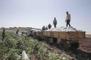 Suriye sınırındaki Reyhanlı ilçesinin Kuşaklı Mahallesi’nde pamuk işçileri sabahın erken saatlerinde hasat gerçekleştiriyor.