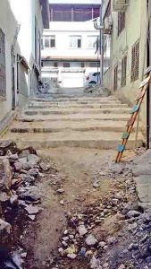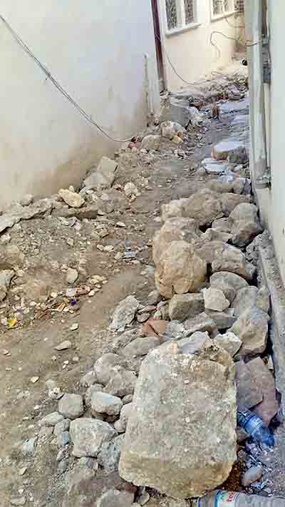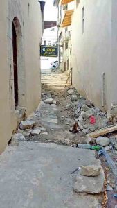 S.F. >> Burada ilk çalışma yapılırken de görmüştüm bu çıkan zemindeki eski yolu, taşları. Ama sanki zemin daha aşağıdaydı. O zemine ek mi yapıldı, düzenlenip, yoksa üzerine ek bir kat mı çıktılar?