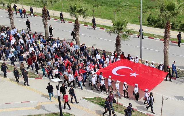 Hatay Mustafa Kemal Üniversitesi’nde Rektör Prof. Dr. Hasan Kaya, Rektör Yardımcıları, Akademisyenler, İdareciler ve öğrenciler büyük bir Türk Bayrağı arkasında yürüyerek, Mehmetçiğin yanında ve desteğinde olduklarını yineledi. MKÜ’deki yürüyüşe personel ve öğrenciler de katıldı.