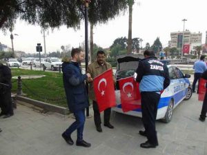 Hatay Büyükşehir Belediyesi 1. Bölge Zabıta Şube Müdürlüğü, Afrin’deki hain terör örgütlerine karşı mücadele veren Mehmetçiklere destek olmak ve vatanın bölünmez bütünlüğüne vurgu yapmak amacıyla Türk Bayrağı dağıttı. Esnafa ve vatandaşlara bayrak dağıtan ekipler, vatandaşlardan, omuz omuza mücadele eden Türk Askerinin muvaffak olması için dualarını esirgememelerini diledi.