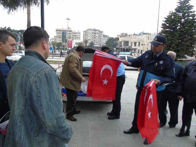Hatay Büyükşehir Belediyesi 1. Bölge Zabıta Şube Müdürlüğü, Afrin’deki hain terör örgütlerine karşı mücadele veren Mehmetçiklere destek olmak ve vatanın bölünmez bütünlüğüne vurgu yapmak amacıyla Türk Bayrağı dağıttı. Esnafa ve vatandaşlara bayrak dağıtan ekipler, vatandaşlardan, omuz omuza mücadele eden Türk Askerinin muvaffak olması için dualarını esirgememelerini diledi.