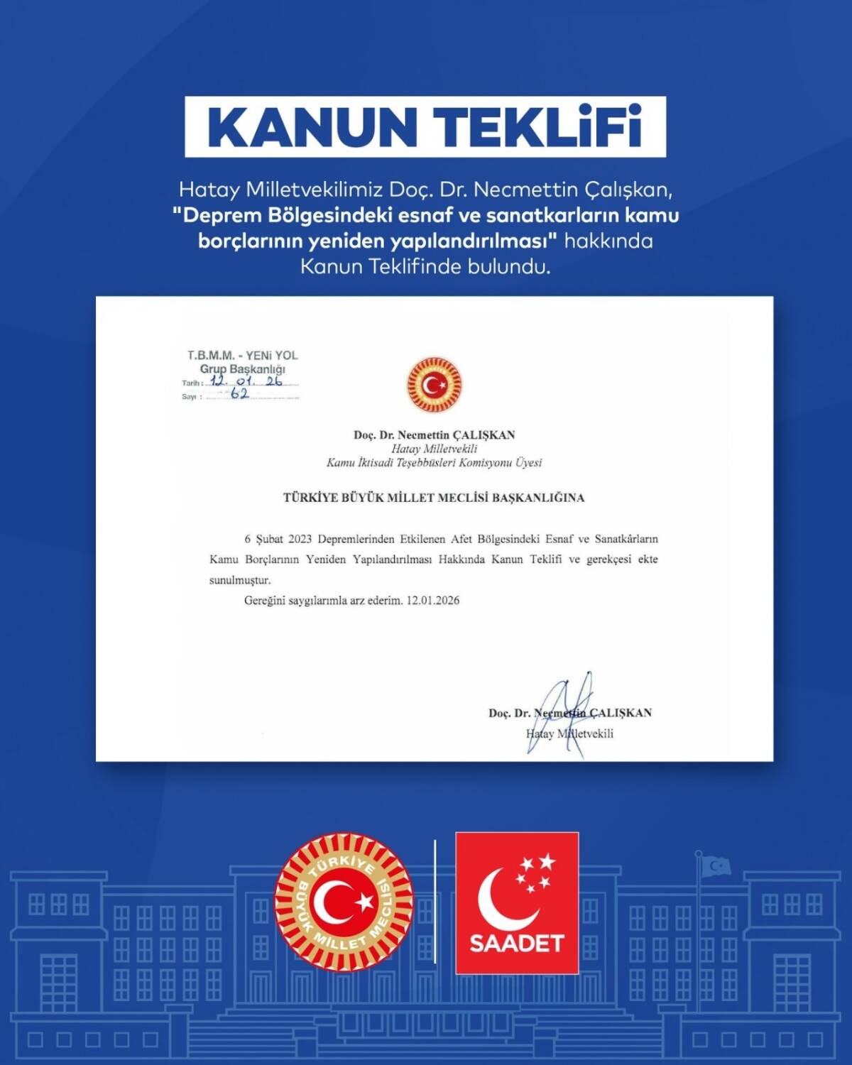 Milletvekili Çalışkan, teklifin gerekçesinde Hatay, Adıyaman ve Kahramanmaraş gibi yıkımın en yoğun yaşandığı bölgelerde ticaretin durma noktasına geldiğini belirterek, devletin bu illerdeki alacaklarından feragat etmesinin bir “sosyal devlet görevi” olduğunu vurguladı. Çalışkan, “Şehirlerimizi ancak esnafımızla, üretimimizle yeniden inşa edebiliriz. Bu kanun teklifi, deprem bölgesinde yeni bir kalkınma hamlesinin başlangıcı olacak” dedi.