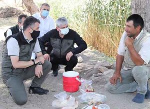 Ağaç altında, iki işçiyi yemek yerken görünce konvoyu durduran Bakan Bekir Pakdemirli ile birlikte Vali Rahmi Doğan ve Milletvekili Hüseyin Yayman, yer sofrasında yemek yiyen iki işçinin yanına gitti, hal-hatır sordu, kısa süreli sohbette bulunarak, sıkıntılarını ve sorunlarını sordu. Bakan Bekir Pakdemirli, yerde bağdaş kurmak suretiyle, dakikalar süren sohbeti derinleştirdi, ardından da işçilere afiyet ve çalışmalarında kolaylıklar dileyerek alandan ayrıldı, yoluna devam etti. -Cemil Yıldız-
