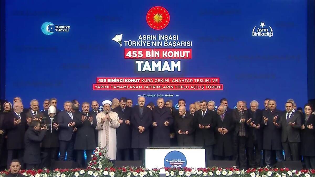Cumhurbaşkanı ve AK Parti Genel Başkanı Recep Tayyip Erdoğan, Hatay’da gerçekleştirilen konut teslim töreninde yaptığı konuşmada, deprem sonrası yürütülen çalışmaların sadece bir inşa süreci olmadığını vurgulayarak, ortaya konulan iradenin millet–devlet dayanışmasının güçlü bir göstergesi olduğunu söyledi.