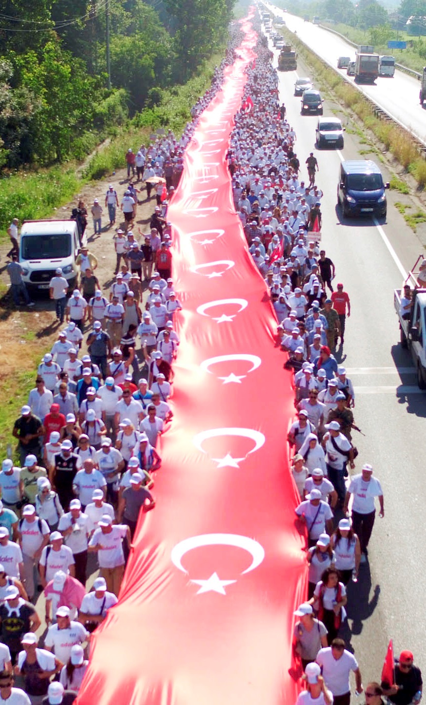 CHP Genel Başkanı Kemal Kılıçdaroğlu, ” Bir ideal için yürüyoruz, Türkiye’de herkesin huzur içinde yaşaması için yürüyoruz, teröre karşı yürüyoruz, terörü lanetlemek için yürüyoruz, terörden mağdur olan aileler için yürüyoruz, 15 Temmuz şehitlerimiz ve gazilerimiz için yürüyoruz, bütün şehit yakınları için yürüyoruz. Zulüm ile abad olunmaz, zulmün karşısındayız. Zulmün yanında değil, mazlumun yanında olmak bizim temel felsefemiz, temel görüşümüz. Mazlumun yanında olmak, haksıza karşı durmak, haklıyı savunmak, bizim temel görevimizdir. Bu yürüyüşümüzü yapmamızın da temel nedeni, haksızlıkların artık Türkiye’de çuvala sığmayacak boyutlara ulaşmasıdır” dedi. -Tamer Yazar-