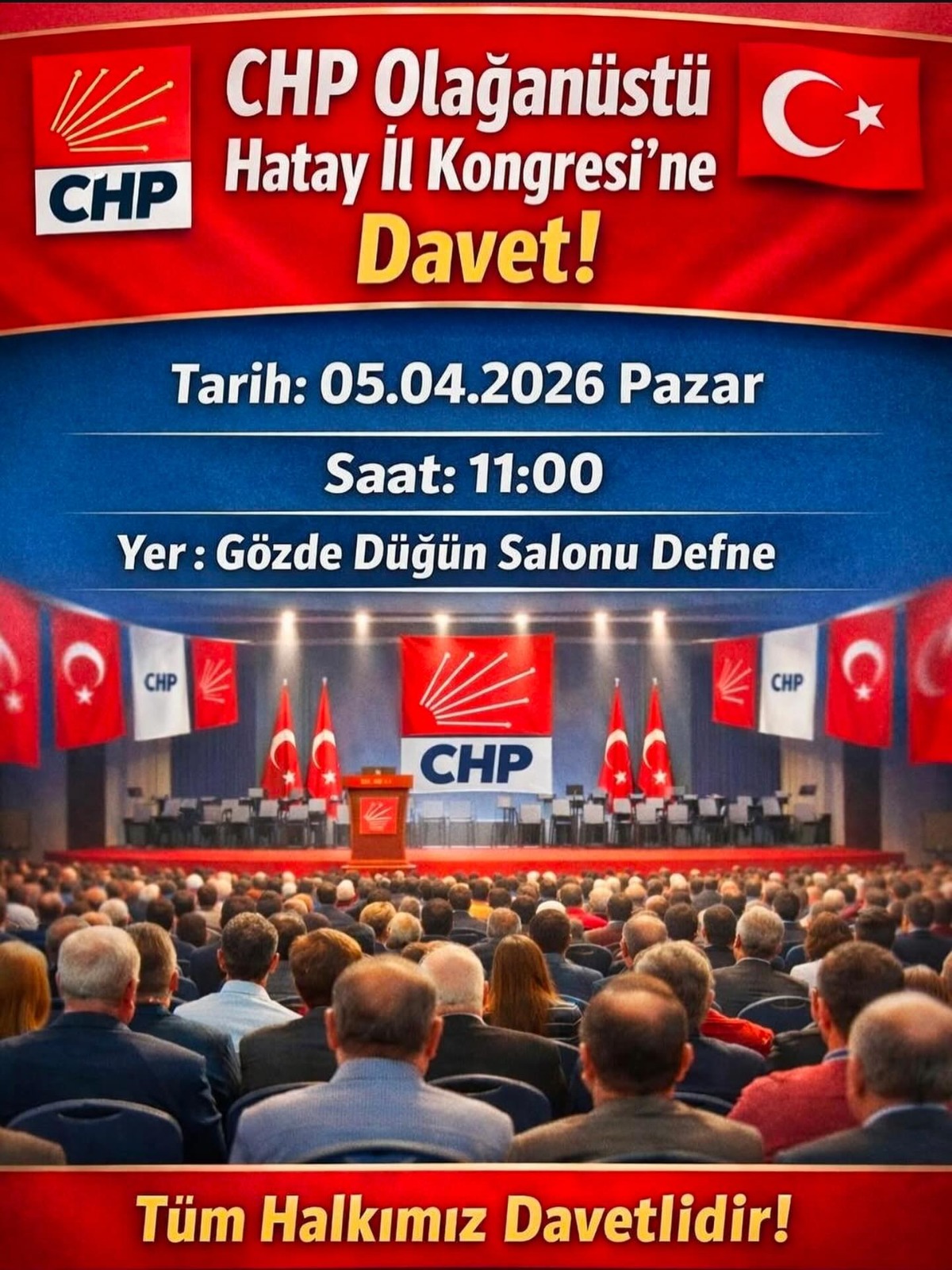 CHP Hatay İl Kongresi, 5 Nisan Pazar günü saat 11.00’de Defne ilçesi Gümüşgöze yolu üzerindeki Gözde Düğün Salonu’nda yapılacak. Kongrede delegeler, yeni il başkanı ve yönetimini belirlemek üzere oy kullanacak.