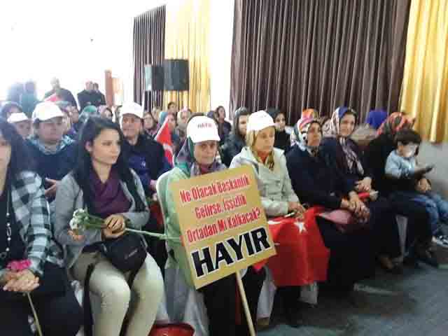 “Şimdi KHK ile kış lastiği takmak mecburi. Bunu dalga geçmek için söylemiyorum. Dün Kanun hükmünde Kararname çıkarıldı. FETÖ’yle mücadele çıkarıldı. Şimdi karla mücadeleye dönüştü. Kanun Hükmünde Kararname maalesef tam bir çocuk oyuncağı oldu. Yine bununla ilgili genelge yayınlandı. Televizyon ekranlarından TRT’den ve diğer kurumlarda artık yanlı yayın yapmak serbest bırakılıyor. Bunun amacı, referanduma giderken tam bir yol temizliği yaparak ‘hayır’ diyenler cezalandırılmaya çalışılıyor. Ama gittiğimiz her yerde görüyoruz. Sadece Cumhuriyet Halk Partililer değil; AKP’ye MHP’ye, diğer siyasi partilere oy veren, kendi çocuklarının geleceğini düşünen, her türlü baskıya, propagandaya karşı çıkanların ‘hayır’ diyeceğini görüyoruz. Burada gördüğümüz gibi. Bunların amacı; televizyonları susturarak, ‘hayır’ diyenlere baskı yaparak hayır oylarını düşürmek… Ama Türkiye, geçmişte teslim olmadı, bugün de teslim olmayacak.” -Cemil Yıldız-