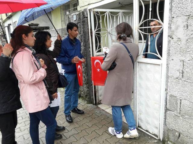 CHP Antakya İlçe Kadın Kolları yönetici ve üyeleri, önceki gün ve dün birlikte Esentepe ile Altınçay Mahallelerinde referandum çalışması yaptı. Kapı kapı evleri dolaşan CHP’li kadınlar, kendilerini ilk karşılayan ev bireyine TÜRK BAYRAĞI hediye ederken, üzerinde neden ‘Anayasa’ya HAYIR’ denilmesi gerektiğinin anlatıldığı bir kahve poşeti veriyor. Antakya İlçe Kadın ve Gençlik Kolları üyeleri, iki gün boyunca Esentepe ile Altınçay Mahallelerinde yüzlerce eve kısa süreli konuk oldu.