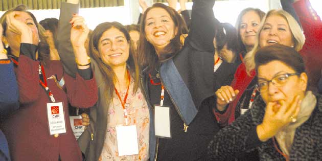 Suzan Dudu, Başkanı Fatma Köse’nin önünde yürüdü. Harbiye’deki toplantıda konuşması öncesinde çalan Parti şarkısı sırasında “Sen de ıslık çal” sözleri mırıldandığında, sahneye Suzan Dudu çıktı ve ıslık çalarak, şenlik havasındaki CHP toplantısına renk kattı. -Cemil Yıldız-