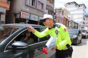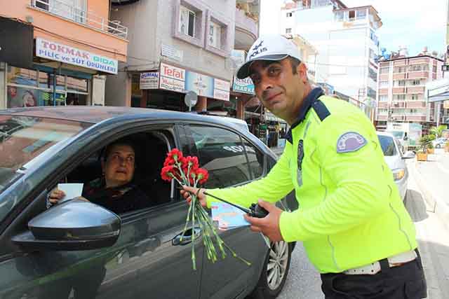 Samandağ’da trafik ekipleri, elde ceza makbuzu yerine çiçekle yollardaydı
