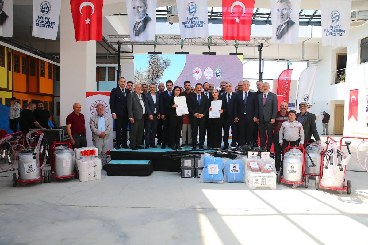 Hatay Büyükşehir Belediyesi EXPO Kompleksi Habitat Toplantı Salonu’nda düzenlenen törende; 510 adet zeytin hasat ekipmanı, 360 adet süt sağım makinesi ve 360 adet hijyen seti afetzede üreticilere dağıtıldı.