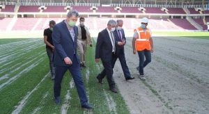Vali Doğan, çim serme işi tamamlanan Hatay Stadyumu’nda incelemede bulundu.