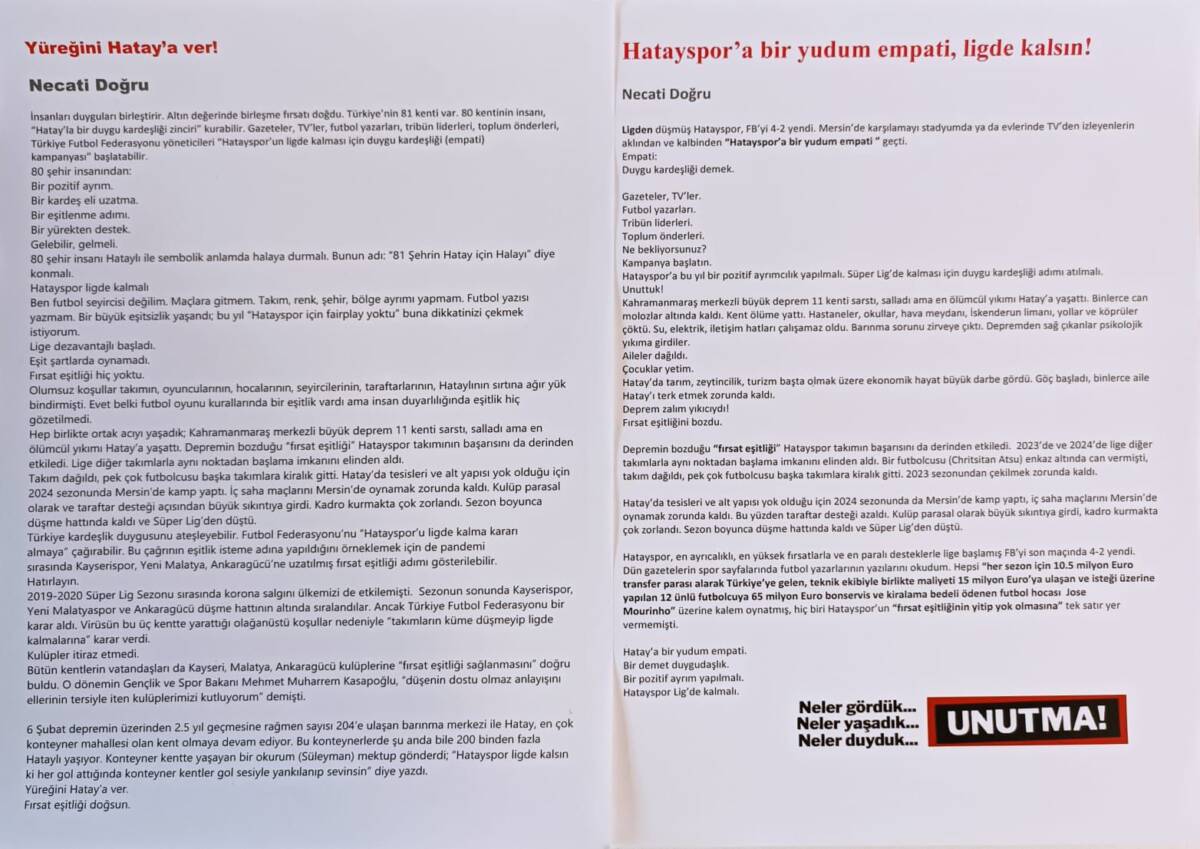 Gazeteci-yazar Necati Doğru’nun Hatayspor için kaleme aldığı “Yüreğini Hatay’a ver!” ve “Hatayspor’a bir yudum empati, ligde kalsın!” başlıklı yazılarına da gönderme yapan Çirkin, bu çağrıların altına imzasını attığını belirtti. “Bu yazılarda ifade edilen duygu kardeşliği ve dayanışma, bugünün Türkiye’sinde ihtiyaç duyduğumuz en temel erdemdir” ifadelerini kullandı.
