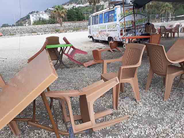 Dün sabah saat 09.30 sıralarında, Samandağ Deniz-Çevlik’te bir anda yaşanan şiddetli rüzgar ve fırtına nedeniyle çadırlar söküldü, barakalar devrildi, masalar ve sandalyeler yerle bir oldu, sahildeki şemsiyeler adeta uçtu. Herşey, 2-3 dakikada oldu. Ardından rüzgar tamamen durdu ve yerini, şiddetli ve yüksek sıcağa, yüksek neme bıraktı.