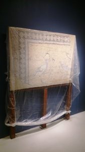 Boş duvara eklenmiş mozaikte dikkatimizi çeken ilk şey, üzerini tümüyle kapatan şeffaf plastik bir kılıf! Diğer mozaiklerden farklı olarak 3 demir ayak üzerine oturtulmuş mozaiğin bu ‘paketlenmiş’ halinde durup merakımızı gidermek istedik açıkçası! Sergi alanına ekli bir mozaik ‘neden bu durumda’ sorgulamak istedik! Yanına yaklaştık ve gördüklerimizi netleştirmek istedik. Gördüklerimiz mi?