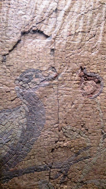 Üzerinde bir kuş figürü olan mozaikte dikkatimizi ilk çeken şey, orta üst noktasından başlamak üzere, yaşanan derin çatlamalar ve ezilmeler oldu. Ezilmelerin olduğu kısımlar mozaiğin belli bölümlerinde öylesine derinleşmiş ki, aklınıza gelen ilk şey, mozaiğin sergi alanına yerleştirilmesi sırasında başına bir kaza gelip gelmediği! Üzeri, yaşanan bu durum nedeniyle ‘kapatılmak istenen’ mozaiğin bu haliyle neden sergi alanında ve ziyaretçilere açık bir bölümde tutulduğu henüz bilinmiyor. Ancak, mozaikteki bu ‘bozulmayı’ kapatmak ve ‘göstermemek’ bir amaç ise, ki madem sergi alanından da kaldıramadık, şeffaf olmayan bir örtü ya da kılıf kullanmayı tavsiye etsek mi?