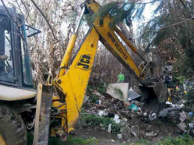 Defne Belediyesi, Harbiye Mahallesi’nde bir evde yüzlerce kilo ağırlığında, aylardır, belki de yıllardır saklı tutulan çöp buldu. Sağlık sorunu oluşturan çöpler, ancak iş makinası ile temizlenebildi. Çöp evin temizlik çalışmalarına başlayan ekipler, evin üst kısmında bulunan menfezden gelen suyun evin çevresini bataklığa çevirmesi ve kepçelerin girememesi üzerine, Defne Belediyesi Fen İşleri Müdürlüğü’ne haber verdi ve dolgu malzemesi serimi için çalışmalarına ara vermek zorunda kaldı. Yapılan denetim sonucunda; eski gıda maddeleri, çöp dolu çuvallar, sokaklardan toplanmış küflü eşyalar, teneke kutuları ile poşetlerden ve yıllardır biriktirildiği öğrenilen çöplerden oluşan çöp evin temizleme, ilaçlama ve dezenfekte çalışmalarına dolgu malzemesi seriminin ardından başlandı. -A. Halik Görün-