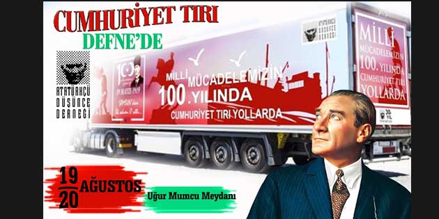 Milli mücadelenin 100. yılı ve Atatürkçü Düşünce Derneği’nin 30’ncu kuruluş yıldönümü dolayısı ile Samsun’dan yola çıkan, içerisinde Atatürk ve Milli Mücadele Tarihi müzesi bulunan Cumhuriyet Tırı bugün ile yarın (19-20 Ağustos Pazartesi-Salı günleri) ilimiz Defne ilçesinde olacak.