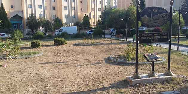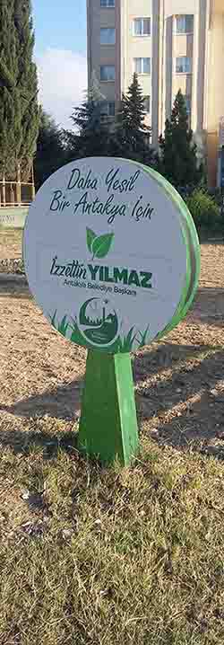 Şehit Metin Sürer Parkı’na gelenler, TOKİ konutlarının hemen önündeki park alanında yer alan bu ibareye ve altında imzası olan Antakya Belediyesi’ne soruyor… ‘Bahse konu yeşil, nerede?’