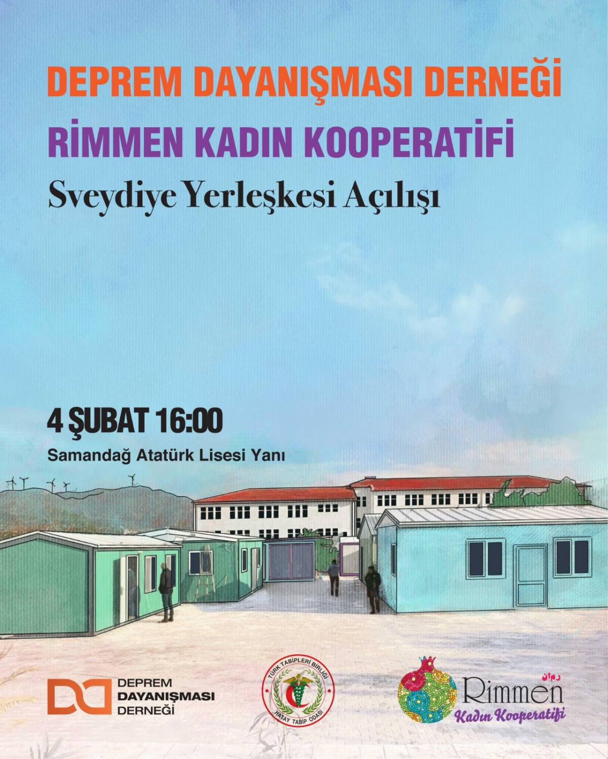 Deprem sonrası dayanışmayı büyütmek ve sürdürülebilir bir yaşam alanı inşa etmek amacıyla kurulan Deprem Dayanışması Derneği ve Rimmen Kadın Kooperatifi, uzun süredir devam eden çalışmalarının meyvesini alıyor. Büyük bir emek, destek ve dayanışma ile inşa edilen Süveydiye Yerleşkesi açılışa hazırlanıyor.