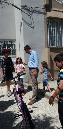 Defne Kaymakamı Nevzat Şengök’e Armutlu ve Elektrik mahallelerindeki Bisiklet Dağıtımına mahalledeki sosyal yardımlaşma derneği Başkanı Tevfik Erkek de katılarak eşlik etti.