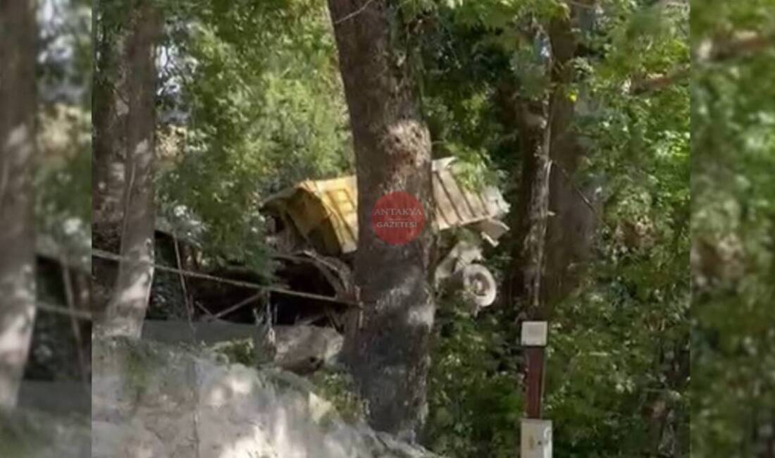 Hatay’ın Defne ilçesinde 3 hafta önce yaşanan trajik kazanın ardından ilginç bir manzara hala yerinde duruyor. Freni boşalan hafriyat kamyonunun Harbiye Şelaleleri’ne uçması sonucu HATSU çalışanı Mehmet Çakrak hayatını kaybetmiş, 1 kişi de yaralanmıştı. Ancak olayın ardından geçen 22 gün boyunca kamyon olduğu yerde, ağaçlar arasında asılı şekilde bekliyor.