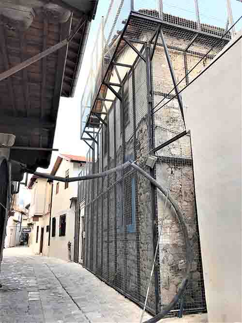 geçmişinden kalan, kalabilen yapılarından sadece biri. Son dönem Antakya’sında sıkça gördüğümüz ‘demir kafes’ örneklerinden biri, bu yapıda da uygulanmış. Taş bedeninde beliren derin çatlaklar ve hatta kırılmaların yaratabileceği riskler düşünülerek, bu çözüm bulunmuş. Ancak eleştirilen şey, “Bu kadar masraf yapılıp demirden elbise giydireceklerine, tamiratı için para harcasalarmış” noktasında!