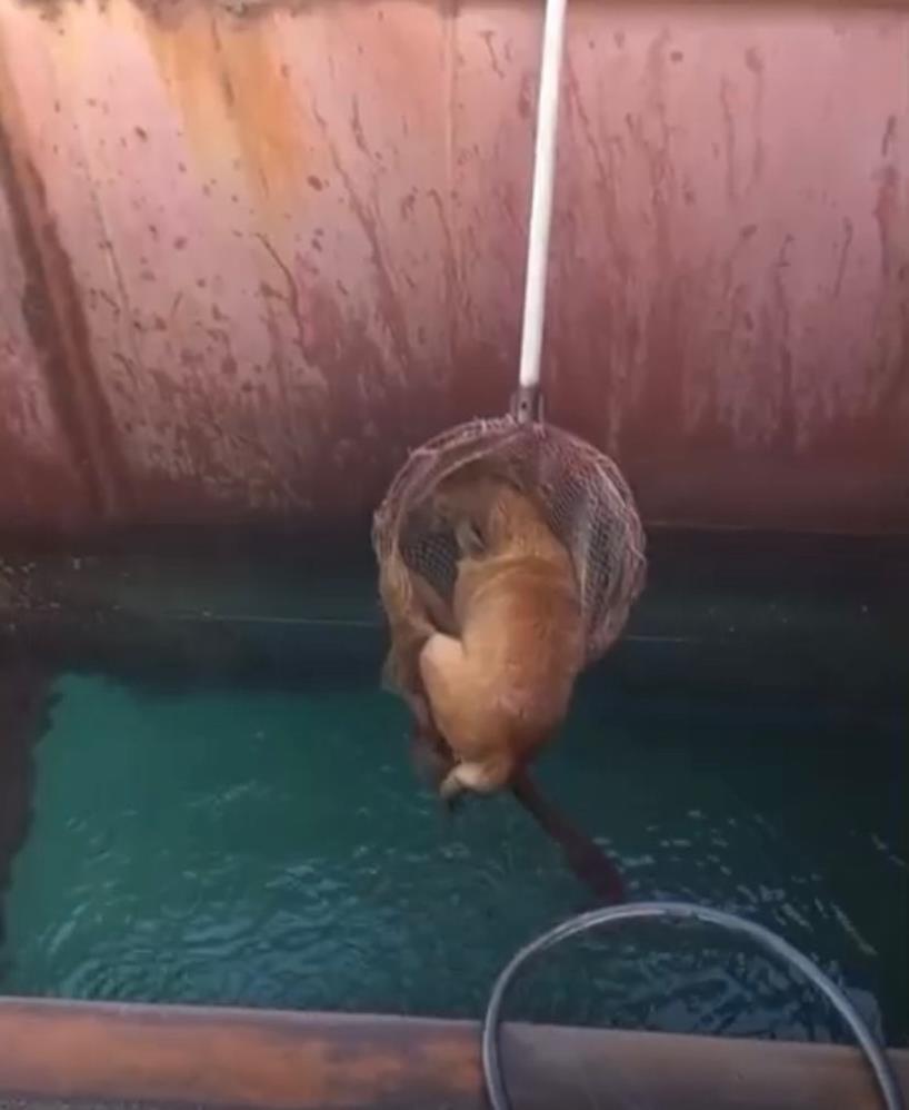 Hatay’ın Dörtyol ilçesinde, balıkçı barınağında ilginç bir kurtarma operasyonu yaşandı. Bir köpek, barınaktaki geminin denize açılan havuzuna düşerek mahsur kaldı.