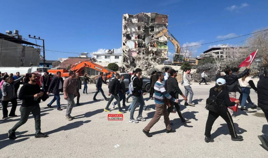 Deprem yıkımlarının devam ettiği şehirde, Suriye’deki soykırım girişimlerine karşı yürüyüş yapan vatandaşlar ile kontrolsüz yıkımlar aynı karede buluştu. Ellerinde Türk bayrakları taşıyan protestocular, hem Suriye’deki sivil ölümlerine hem de Hatay’da süregelen sorunlara dikkat çekmek amacıyla sokaklara döküldü.