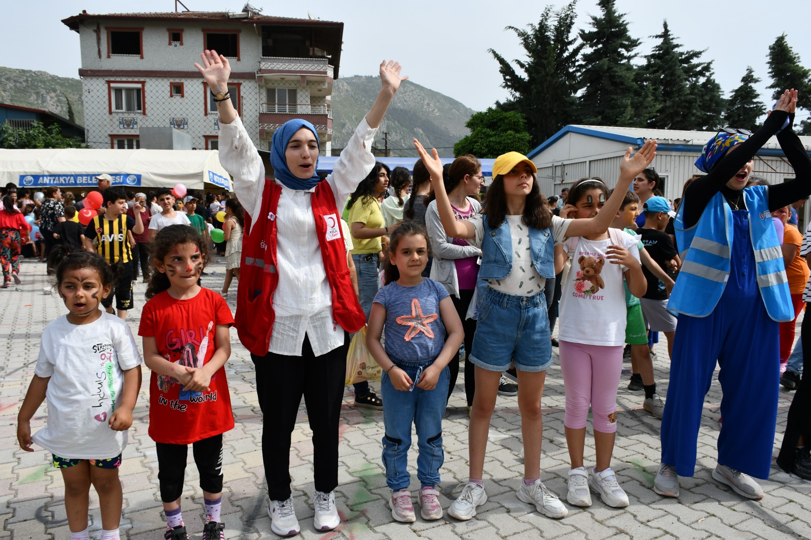 Antakya Mahmut Yarım İlkokulu bahçesinde gerçekleşen şenlikte, depremzede çocuklar müzik eşliğinde oyunlar oynadı.