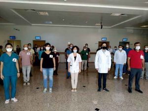 Hatay Tabipler Odası (HTO) öncülüğünde ilimizdeki hekimler, dün saat 12.30’da, kovid kurbanı meslektaşları ve vatandaşlar anısına, görev yaptıkları kurum önünde 1 dakikalık saygı duruşunda bulundu. Her sağlık kurumu önünde gerçekleşen etkinlikle ilgili bir açıklama yapan Hatay Tabipler Odası Başkanı Dr.Sadık Nazik, ileriye yönelik kaygılarının artmakta olduğunu kaydederek, “Yönetemiyorsunuz, tükeniyoruz” mesajı verdi. Suçu vatandaşa, yükü hekimlere ve sağlık çalışanlarına yıkanların tarihsel sorumluluklarını, yılmadan ve her gün hatırlatmaya devam edeceklerini söyleyen Hatay Tabip Odası Başkanı Dr. Nazik, şöyle devam etti:
