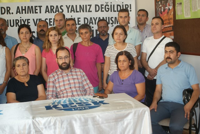 “Ahmet Aras, daha önce Hatay Sağlık Emekçileri Sendikası (SES) Yürütme Kurulu Başkanlığı yapmış, şimdi ise Hatay Tabip Odası Yönetim Kurulu’nda olan ve halen SES üyesi olan aydın, demokrat bir tabip. Yukarıda belirttiğimiz açlık grevine ziyarette bulunan Eğitim Sen üye ve yöneticilerinin de olduğu birçok kişi hakkında soruşturma açılmıştır. Fakat gelinen noktada, Sağlık Bakanlığı tarafından bu açlık grevine ziyaretten dolayı, soruşturmaya dayanarak Tabip Dr. Ahmet Aras’a ‘Devlet Memurluğundan Çıkarma’ cezası istenmiştir. Soruyoruz… Bu ceza teklifini yapan Halk Sağlığı Müdürlüğü’nde Görevli Mehmet Karagöz kimin tetikçiliğini yapmaktadır?