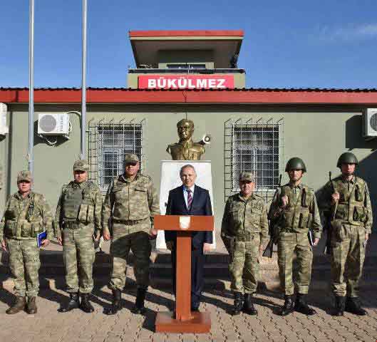 Vali Erdal Ata, önceki gün komutanları da yanına almak suretiyle Suriye sınırında incelemelerde bulundu, Bükülmez Karakolu’na gitti, askerlerle sohbet etti.