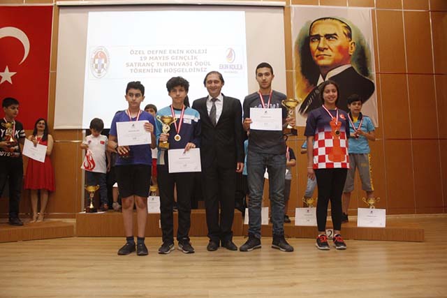 Geçtiğimiz hafta sonunda, 18 Mayıs 2019 Cumartesi günü, Özel Ekin Koleji’nde 5 kategoride toplam 369 sporcunun katılımı ile başlayan Özel Defne Ekin Koleji 19 Mayıs Gençlik Satranç Turnuvası, 369 sporcunun katılımı ile iki gün sürdü. Pazar günkü ödül töreni ile turnuva sona erdi. Her kategorideki birincilere kupa, madalya ve çeyrek altın yanı sıra okula kayıt halinde %75 eğitim bursu verileceği açıklandı. İkincilere ve üçüncülere kupa, madalya ve gram altın ile okula kayıt halinde %50 eğitim bursu verildi. Ayrıca okula kayıt yaptırmaları durumunda, turnuvaya katılan tüm sporculara %30 eğitim bursu sağlanacağı belirtildi.