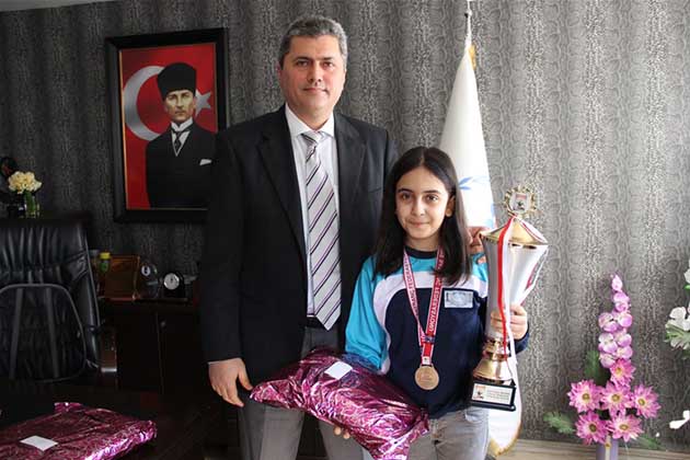 Hafta başında Elif ile okuduğu Okulun Müdür ve Öğretmenleri, birlikte İlçe Milli Eğitim Müdürü Kemal Gülistan’ı ziyaret etti. 2 Nisan Salı günü gerçekleşen ziyarette; Okul Müdürü, Öğretmenler ve Türkiye Satranç Şampiyonu öğrenci Elif Zeren Yıldız ile sohbet eden İlçe Müdürü Gülistan, Elif’in, 11 yaş Türkiye Satranç Şampiyonu olarak, 17 Nisan 2019 tarihinde Antalya’da yapılacak Dünya Satranç Şampiyonası’nda ülkemizi temsil edeceğini söyledi.