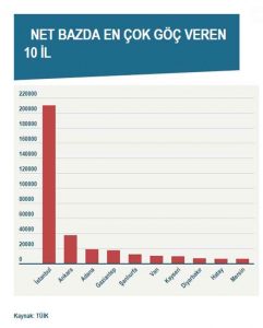 Net bazda en çok göç veren 10 il; İstanbul, Ankara, Adana, Gaziantep, Şanlıurfa, Van, Kayseri, Diyarbakır, Hatay ve Mersin’in geçmiş yıllarda net göç alan iller olması ise dikkat çeken bir diğer husus. 10 ilin toplam verdiği net göç, 335 bin. Göç alan şehirler; Muğla, Antalya, İzmir ve Balıkesir, bu özelliklerini korumaya devam ediyor.